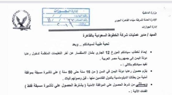 الجوازات المصرية تؤكد قرار تعليق دخول اليمنيين إلا بفيزة مسبقة