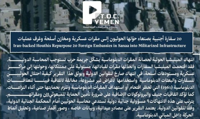 مركز (P.T.O.C) يكشف تحويل الحوثيين 20 سفارة إلى مقرات عسكرية ومخازن أسلحة وغرف عمليات أمنية