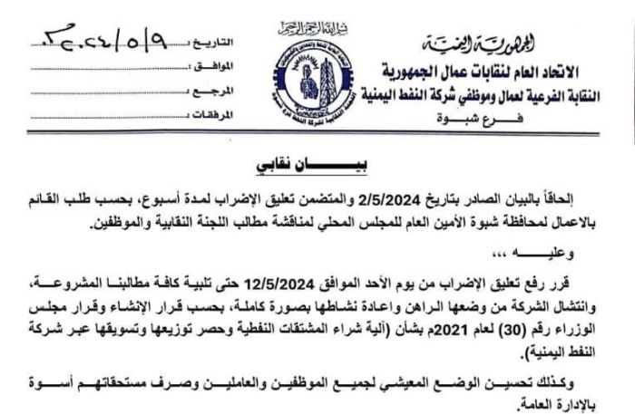 نقابة عمال شركة النفط شبوة تعلن استئناف الإضراب