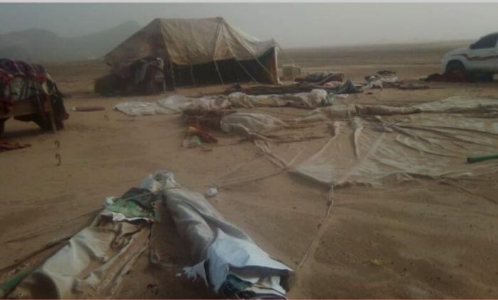الجوف.. أمطار غزيرة مصحوبة برياح تقتلع مخيمات النازحين في منطقة الريان