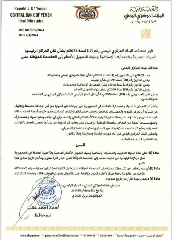 البنك المركزي يمهل البنوك 60 يوماً لنقل مراكز عملياتها من صنعاء إلى عدن