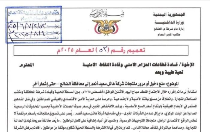 السلطات المحلية بالضالع تمنع دخول منتجات شركة "هائل سعيد أنعم"