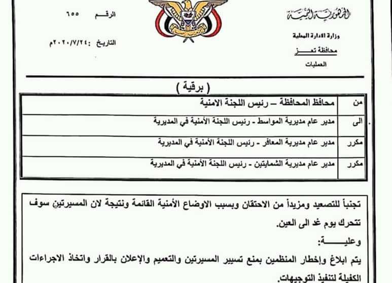 محافظ تعز يوجه بمنع تسيير مسيرتين كانت مقررة السبت إلى العين بالتربة