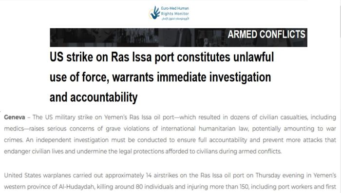 Euro-Med Monitor: US strike on Ras Issa port constitutes unlawful use of force