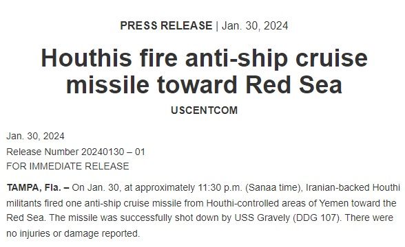 CENTCOM: Houthis fire anti-ship cruise missile toward Red Sea