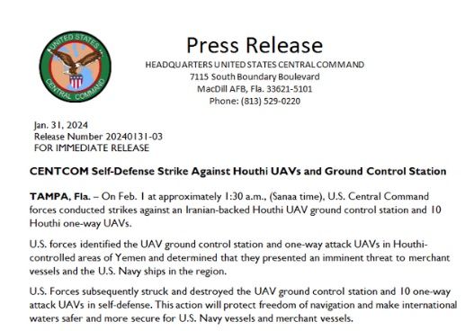 CENTCOM: US destroys 10 Houthi attack drones, control station in Yemen