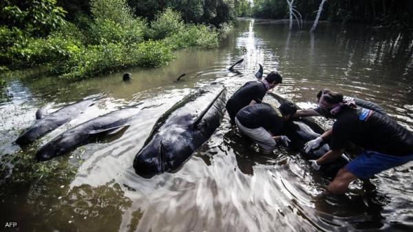 رغم محاولات الإنقاذ.. نفوق عشرات الحيتان في "جنوح جديد"