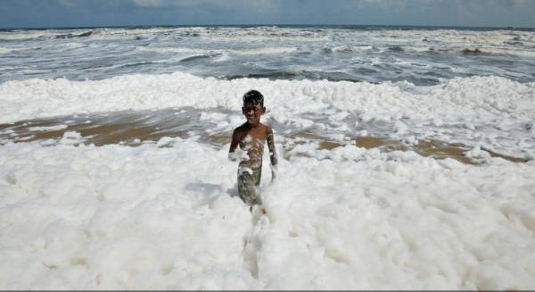 صور مفزعة.. "الرغوة السامة" تغزو الشاطئ والأطفال لا يأبهون