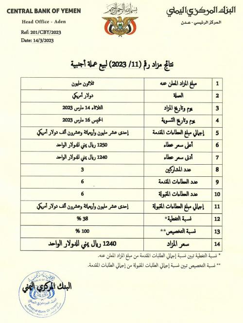 البنك المركزي يعلن نتائج مزاد جديد بسعر 1240 للدولار الواحد