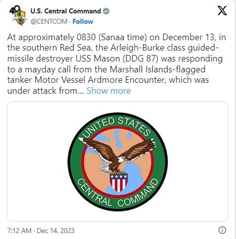 CENTCOM said in a post on X, formerly known as Twitter, Mason shot down an unmanned aerial vehicle launched from Houth rebels-controlled areas,