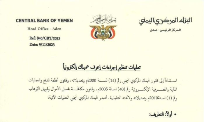 أصدر البنك المركزي في عدن وبدعم فني مقدم من الوكالة الأمريكية للتنمية (USAID) والبنك الدولي "تعليمات تنظيم إجراءات أعرف عميلك إلكترونياً" وعلى الجهات ذات العلاقة الوفاء بمتطلباتها.