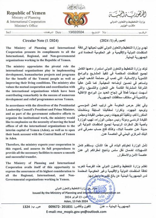 ودعت الوزارة، في تعميم لها إلى أهمية نقل المقرات الرئيسية للمنظمات الدولية والإقليمية وغير الحكومية المعتمدة لدى اليمن إلى عدن وفتح حساب مصرفي لدى البنك المركزي بعدن.