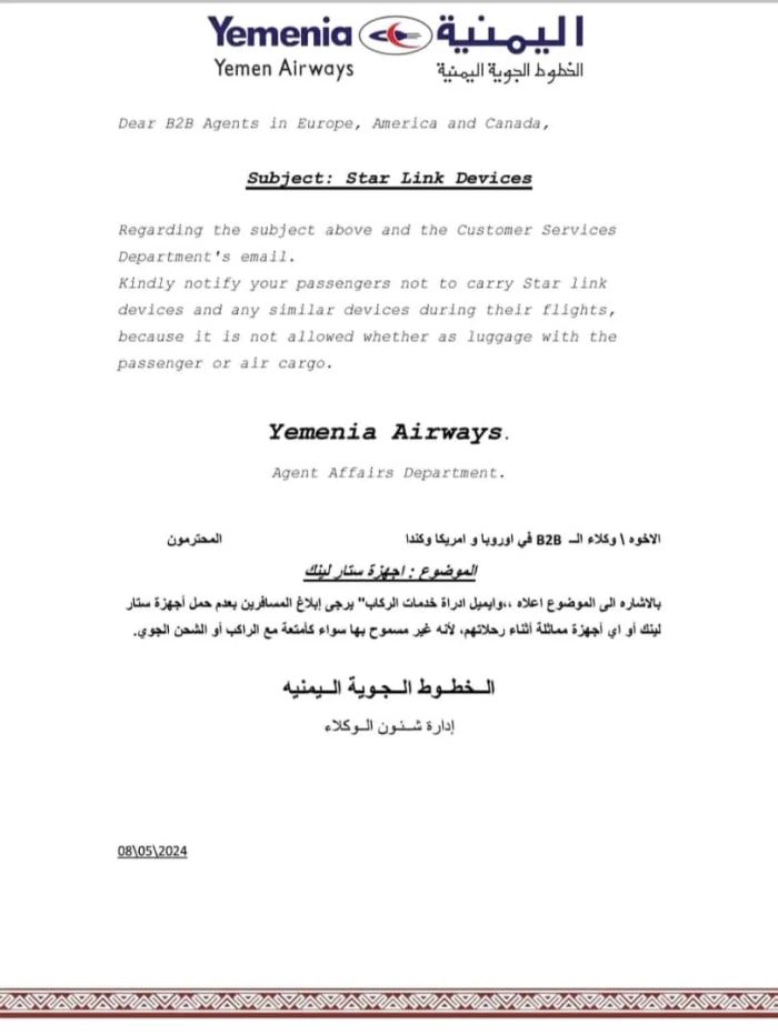 وجهت شركة الخطوط الجوية اليمنية للطيران وكلاءها بمنع المسافرين من حمل أجهزة ستارلينك الخاصة بخدمة الإنترنت الفضائي وإدخالها الى اليمن.