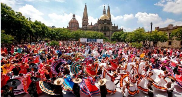 وقد تجمّع الراقصون، وهم أغلبيتهم من مدارس الرقص الفولكلوري، تحت أشعّة الشمس الحارقة في ساحة التحرير في وسط غوادالاخارا عاصمة ولاية خاليسكو.