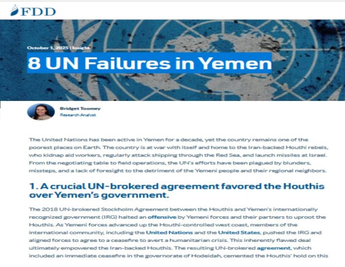 The author of the analysis, Bridget Toomey, who is a research analyst at FDD, where she focuses on Iranian proxies, specifically Iraqi militias and the Houthi, found that the UN is facing several failures in Yemen mainly: