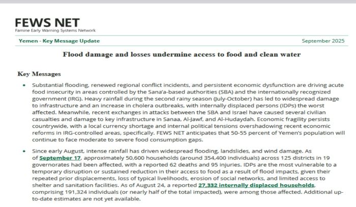 Substantial flooding, renewed regional conflict incidents, and persistent economic dysfunction are driving acute food insecurity in areas controlled by the Houthi rebels and the internationally recognized government (IRG), according to a recent analysis published by the Famine Early Warning Systems Network (FEWS NET)