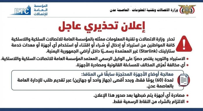 حذّرت وزارة الاتصالات وتقنية المعلومات في عدن، المواطنين من استيراد أو إدخال أو شراء أو اقتناء أو استخدام أي أجهزة أو معدات خدمة "ستارلينك" غير المعتمدة رسمياً داخل أراضي الجمهورية اليمنية، مؤكدة أن أي تعامل خارج القنوات الرسمية يُعد مخالفة صريحة للقوانين والأنظمة النافذة.