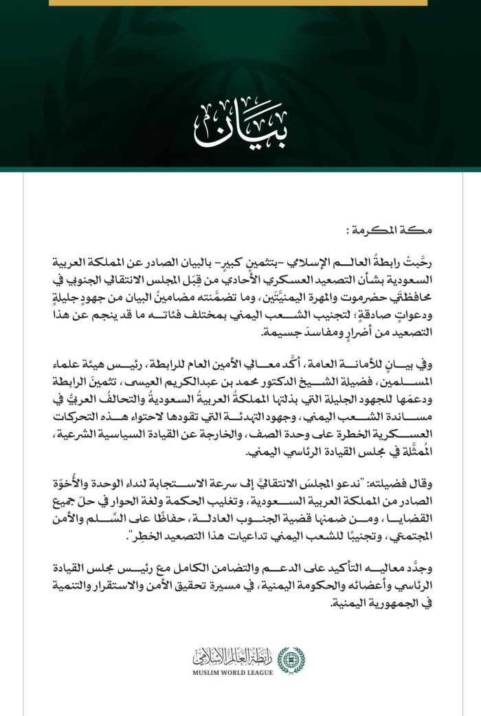 أعلنت رابطة العالم الإسلامي عن ترحيبها وتثمينها الكبير للبيان الصادر عن المملكة العربية السعودية بشأن التصعيد العسكري الأحادي من قِبل المجلس الانتقالي الجنوبي في محافظتي حضرموت والمهرة اليمنيتين.