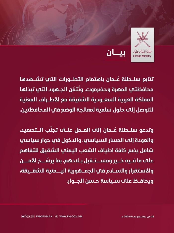 أصدرت وزارة الخارجية العُمانية بياناً أكدت فيه متابعة السلطنة باهتمام بالغ للتطورات الأخيرة التي تشهدها محافظتا المهرة وحضرموت في الجمهورية اليمنية الشقيقة.
