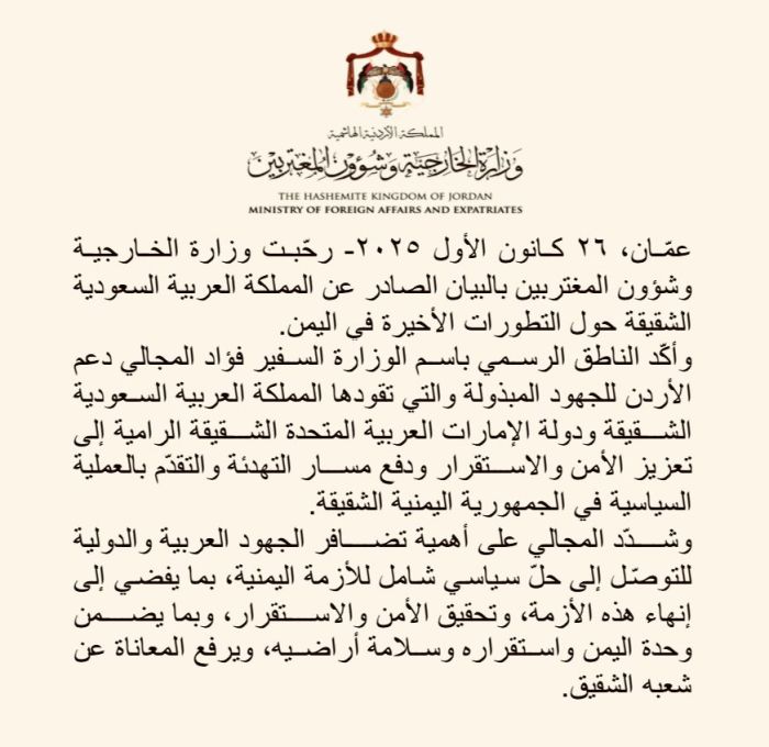 وأكّد الناطق الرسمي باسم الوزارة السفير فؤاد المجالي دعم الأردن للجهود المبذولة والتي تقودها المملكة العربية السعودية الشقيقة ودولة الإمارات العربية المتحدة الشقيقة الرامية إلى تعزيز الأمن والاستقرار ودفع مسار التهدئة والتقدّم بالعملية السياسية في الجمهورية اليمنية الشقيقة.