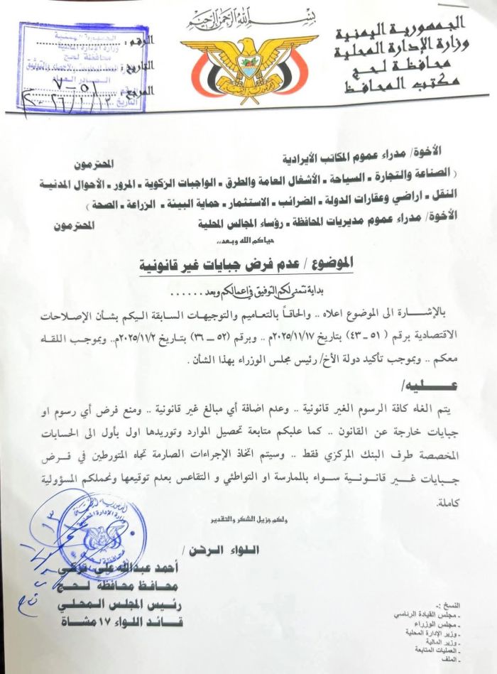 و أكد التوجيه على اتخاذ إجراءات قانونية صارمة تجاه المتورطين في فرض أي جبايات غير قانونية، سواء عبر الممارسة المباشرة أو التواطؤ، محذراً المسؤولين من التغاضي عن هذه التجاوزات.