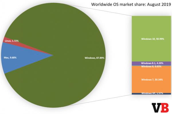 على الرغم من تراجع حصة ويندوز بحوالي النصف بالمئة، إلا أنه مازال يسيطر على 87.89% والأبرز أن ويندوز 10 أصبح ينتشر في أكثر من نصف حواسب ويندوز.